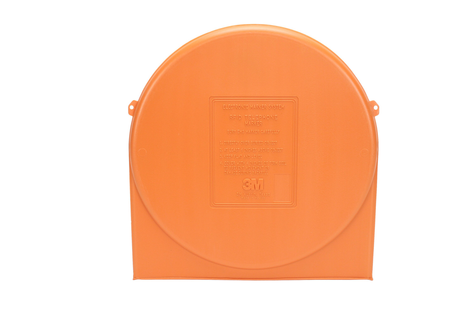 Der orange 3M™ EMS Full Range Marker – Telefon macht das Markieren und damit auch das spätere Orten unterirdischer Telefonleitungen mit den 3M™ Dynatel™ Markerortungsgeräten denkbar einfach.Er kann bis zu einer maximalen Tiefe von 2,40 Metern im Erdreich geortet werden, ist unempfindlich gegen Mineralien, Chemikalien und Temperaturwechsel und somit für jegliches Erdreich geeignet. Aufgrund seines Durchmessers von 38,1 Zentimetern bei einer Höhe von 1,65 Zentimetern und seiner horizontalen Einbaulage dient er unter anderem auch als "Schutzschild" für Muffenkörper. Die elektronischen Marker gelten als zuverlässigste Methode, bestehende oder neu zu installiernde Einrichtungen zu markieren – auch unter Schnee. Ihre Funktion wird weder von metallischen Kanälen oder Rohren noch von Zäunen oder Hochspannungsleitungen beeinflusst.