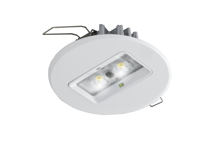 Sicherheitsleuchte als LED-Einbau-Downlight, runde Abdeckung. Dezente, kleine Sicherheitsleuchte aus weißem Kunststoff (RAL 9003), mit optimierter Ausleuchtung großer quadratischer Flächen zur Erreichung besonders weiter Montageabstände bei Decken-höhen von 2,5 bis 4,5 m, geeignet zum Einbau in Decken mit flachen Hohlräumen, für sehr einfache, schnelle Montage und Installation.