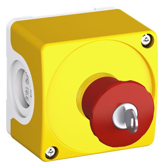 1-fach Kunststoffgehäuse gelb/hellgrau Not-Halt Taste 40mm, 1 S + 1 OE Schlüsselentriegelung