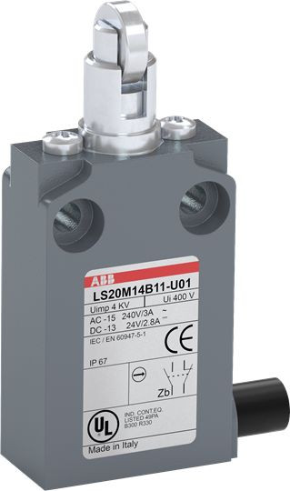 LS20M14B11-U01 ist ein 30 mm breiter, kompakter Positionsschalter aus Zinklegierungsmaterial (Zamak), mit 2 Befestigungsbohrungen M4 oben, einem vorverdrahteten UL62 - PVC-Kabel (1 m) an der Seite, einem abgeflachten Stahl-Rollendruckbolzen sowie 1 Öffner + 1 Schließer als Sprungkontakt