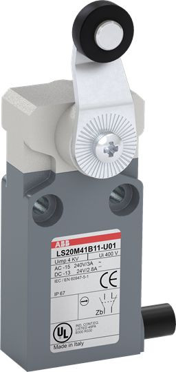 LS20M41B11-U01 ist ein 30 mm breiter, kompakter Positionsschalter aus Zinklegierungsmaterial (Zamak), mit 2 Befestigungsbohrungen M4 oben, einem vorverdrahteten UL62 - PVC-Kabel (1 m) an der Seite, einem abgeflachten Stahl-Rollendruckbolzen sowie 1 Öffner + 1 Schließer als Sprungkontakt