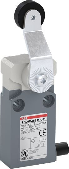 LS20M45B11-U01 ist ein 30 mm breiter, kompakter Positionsschalter aus Zinklegierungsmaterial (Zamak), mit 2 Befestigungsbohrungen M4 oben, einem vorverdrahteten UL62 - PVC-Kabel (1 m) an der Seite, einem abgeflachten Stahl-Rollendruckbolzen sowie 1 Öffner + 1 Schließer als Sprungkontakt