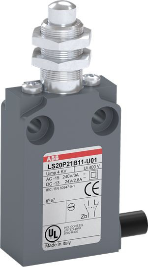 LS20P21B11-U011 ist ein 30 mm breiter, kompakter Positionsschalter aus glasfaserverstärktem UL-V0-Material, mit 2 Befestigungsbohrungen M4 oben, einem vorverdrahteten UL62 - PVC-Kabel (1 m) an der Seite, einem abgeflachten Messingdruckbolzen mit Feststellmuttern sowie 1 Schließer + 1 Öffner als Sprungkontakt