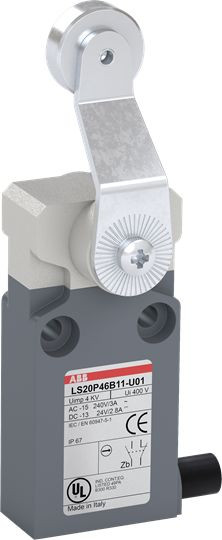 LS20P46B11-U01 ist ein 30 mm breiter, kompakter Positionsschalter aus glasfaserverstärktem UL-V0-Material, mit 2 Befestigungsbohrungen M4 oben, einem vorverdrahteten UL62 - PVC-Kabel (1 m) an der Seite, einem abgeflachten Metall-Rollenschwenkhebel sowie 1 Schließer + 1 Öffner als Sprungkontakt