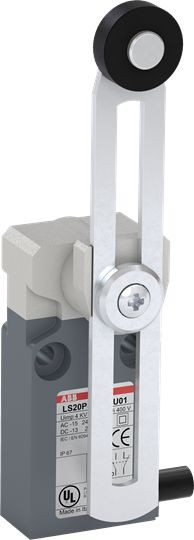LS20P12B11-U01 ist ein 30 mm breiter, kompakter Positionsschalter aus glasfaserverstärktem UL-V0-Material, mit 2 Befestigungsbohrungen M4 oben, einem vorverdrahteten UL62 - PVC-Kabel (1 m) an der Seite, einem abgeflachten, verstellbaren Rollenschwenkhebel sowie 1 Schließer + 1 Öffner als Sprungkontakt