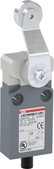 LS21M46B11-U01 ist ein 30 mm breiter, kompakter Positionsschalter aus Zinklegierungsmaterial (Zamak), mit 2 Befestigungsbohrungen M4 oben, einem vorverdrahteten UL62 - PVC-Kabel (1 m) an der Seite, einem abgeflachten Stahl-Rollenschwenkhebel sowie 1 Öffner + 1 Schließer als Sprungkontakt