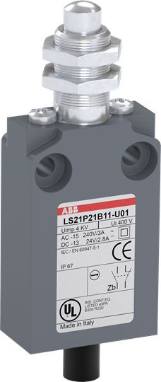 LS20P12B11-U01 ist ein 30 mm breiter, kompakter Positionsschalter aus glasfaserverstärktem UL-V0-Material, mit 2 Befestigungsbohrungen M4 oben, einem vorverdrahteten UL62 - PVC-Kabel (1 m) an der Seite, einem abgeflachten Messingdruckbolzen sowie 1 Schließer + 1 Öffner als Sprungkontakt