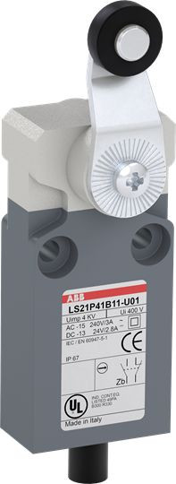 LS21P41B11-U01 ist ein 30 mm breiter, kompakter Positionsschalter aus glasfaserverstärktem UL-V0-Material, mit 2 Befestigungsbohrungen M4 oben, einem vorverdrahteten UL62 - PVC-Kabel (1 m) an der Seite, einem abgeflachten Kunststoff-Rollenschwenkhebel sowie 1 Schließer + 1 Öffner als Sprungkontakt