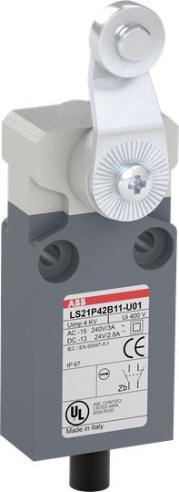 LS21P42B11-U01 ist ein 30 mm breiter, kompakter Positionsschalter aus glasfaserverstärktem UL-V0-Material, mit 2 Befestigungsbohrungen M4 oben, einem vorverdrahteten UL62 - PVC-Kabel (1 m) an der Seite, einem abgeflachten Stahl-Rollenschwenkhebel sowie 1 Schließer + 1 Öffner als Sprungkontakt