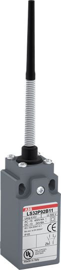 Der LS33P92B11 ist ein 30 mm breiter Positionsschalter aus glasfaserverstärktem UL-V0-Material, mit 2 Befestigungsbohrungen oben, 1 Kabeleinführung nach ISO M20 x 1,5 unten, einem abgeflachten Federstab aus Stahl sowie 1 Schließer + 1 Öffner als Sprungkontakt