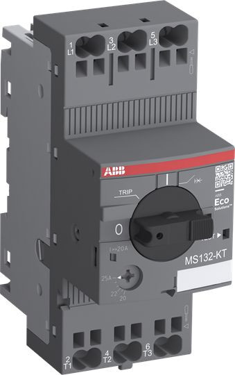Transformatorschutzschalter MS132-KT in schraubenloser Push-in Federanschlusstechnik mit thermischem und elektromagnetischem Schutz steht für die kompakte und leistungsstarke Baureihe mit hohem Kurzschlussausschaltvermögen für den Transformatorschutz bis 25 A mit einer Modulbreite von 45 mm. Bei diesem Gerät wird der primärseitige Transformatornennstrom durch Einstellen an der Stromskala thermisch überwacht. Die Kurzschlussauslösung erfolgt bei Auftreten des 20-fachen Gerätenennstroms. Das temperaturkompensierte Gerät hat eine Drehgriffbedienung mit einer klaren Schaltstellungsanzeige I/TRIP/0. Darüber hinaus verfügt MS132-KT über eine Kurzschlussanzeige. Der Drehgriff ist mit Hilfe eines Vorhängeschlosses in 0-Position direkt verriegelbar. Hilfs-, Signal- und Kurzschlussmeldekontakte sowie Unterspannungs- und Arbeitsstromauslöser können ohne Werkzeug angebaut werden. Push-in Feder Varianten gibt es für Hilfs- und Signalkontakte, diese passen auch an die Transformatorschutzschalter in Schraubtechnik .