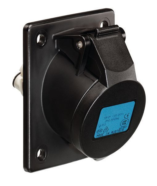 | Kurzbeschreibung | CEE Flanschsteckdose schräg 20°, schwarz, IP44, 16A, 3-polig, 230V, 6h, blau |