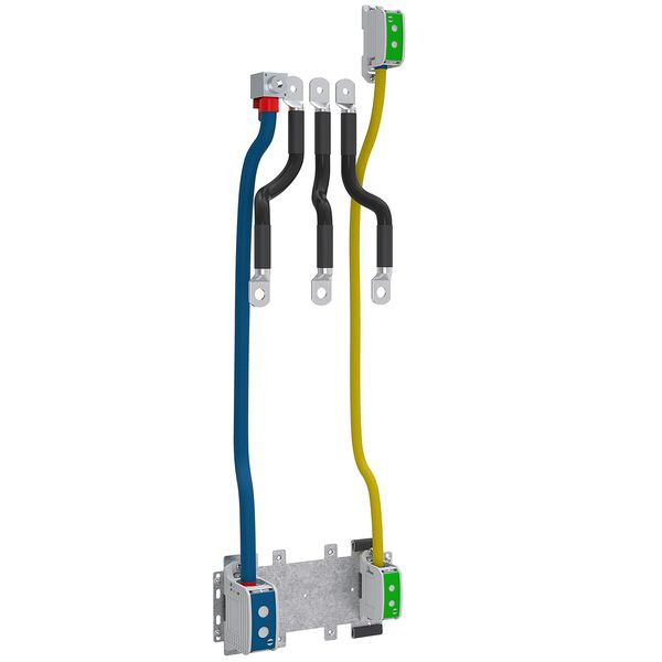 Primärverdrahtungssatz 200 A 95 mm² für Lasttrennschalter 250 A 4p im AAR und ohne Trennstelle im NAR, bestehend aus: 3 Leitungen mit Ringkabelschuh, PE-Klemme im AAR, Leitung für N und PE, Klemmen für N und PE im NAR, Feldbreite 1, Bauhöhe 9
