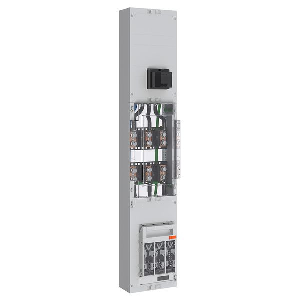 Wandlerfeld 200 A Dauerstrom bestehend aus: 1x NAR mit 40 mm Sammelschiene 2x12x5 mm bestückt mit NH1 Trenner, 1x Wandlermodul BxH 250x450 mm mit Klarsichtabdeckung für Wandlerlaschen Bauform A mit 30 mm Breite, 1x AAR mit motorbetriebenem Lasttrennschalter NSX 4-polig 250 A für NA-Schutz Anwendung und PE Klemme