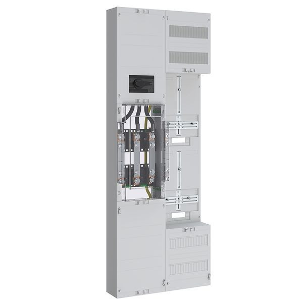 Wandlerfeld 200 A Dauerstrom nach TAB Netze BW bestehend aus: 1x Anschluss für Verteilerfeld mit NAR 5-polig, 1x Wandlermodul BxH 250x450 mm mit Klarsichtabdeckung für Wandlerlaschen Bauform A mit 30 mm Breite, 1x AAR BxH 250x450 mm mit Lasttrennschalter 3-polig 250 A und Klemme für N und PE, 1x 3-Punkt Zählerplatz 375 mm, 1x 3-Punkt FRE-Platz 375 mm, 1x Wandlerzusatzraum 300 mm 24 TE bestückt mit Spannungspfadsicherungen und Wandler-Trennklemmen nach TAB Netze BW