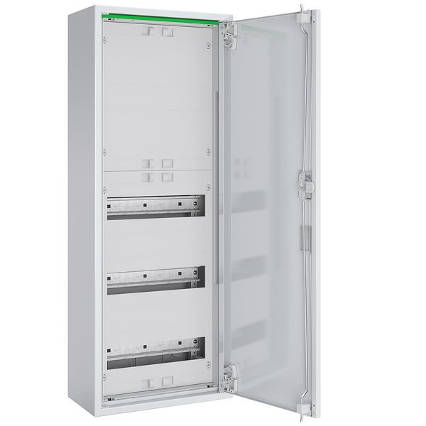 Komplettschrank für Aufputzmontage bestehend aus: RM-Gehäuse mit Volltür, 1x Verteilerfeld 3-reihig, 36 TE, für Reiheneinbaugeräte, mit geschlossenener Abdeckung und isolierten Gerätetragschienen für Reihenklemmen, IP44