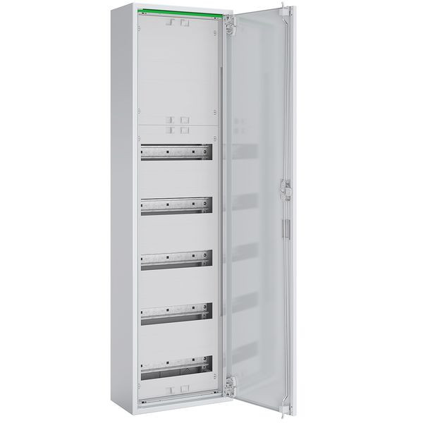 Komplettschrank für Aufputzmontage bestehend aus: RM-Gehäuse mit Volltür, 1x Verteilerfeld 5-reihig, 60 TE, für Reiheneinbaugeräte, mit geschlossenener Abdeckung und isolierten Gerätetragschienen für Reihenklemmen, IP44