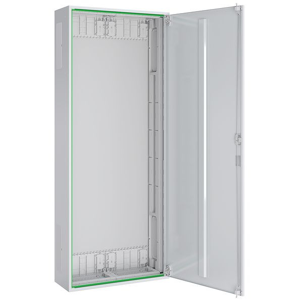 Systemgehäuse für AP-, UP- und teilversenkter Montage, bestehend aus: Leergehäuse mit flächenbündiger Leitungsmembran, seitlichen Vorprägungen für Querverdrahtung im AAR und Sammelschienenverbindung im NAR, Volltür, Abmessungen: 550x1400x210 mm, Schutzklasse II (schutzisoliert), Schutzart IP54, Stahlblech pulverbeschichtet, 216 Teilungseinheiten,