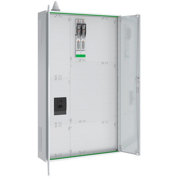 Vorsicherungsgehäuse bestehend aus: 2x NH-Trennleisten Gr. 00, Sammelschienensystem 5-polig, 8x Anschlussklemmen 185 mm² AL, 2x Anschlussklemmen 120 mm² CU, 4x Anschlussklemmen 70 mm² CU, Hutschiene für Überspannungsschutz, um 7x NH-Trennleisten Gr. 00 erweiterbar
