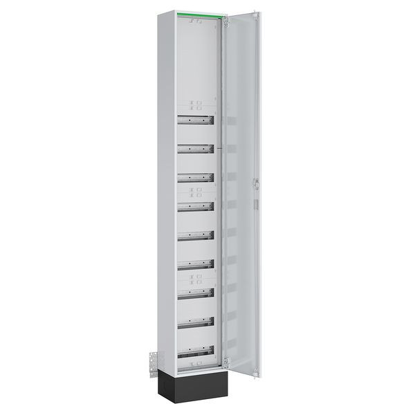 Komplettschrank für Standmontage bestehend aus: RS-Gehäuse mit Volltür, Standsockel, Feldbreite 1, Bauhöhe 12, Verteilerbereich 9-reihig, 108 TE, für Reiheneinbaugeräte, Reihenklemmenbereich 3-reihig, geschlossene Abdeckung, isolierten Gerätetragschienen, für Reihenklemmen, IP44