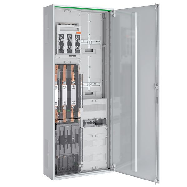 Wandlermess-Schrank 200 A nach TAB Hamburger Energienetze bestehend aus: Zähleschrank Schutzisoliert IP44, 1x NAR mit NH2 Unterteil mit Klarsichtabdeckung und N/PE Anschluss, 1x Wandlermodul 450 mm für Wandlerlaschen Bauform A mit 30 mm Breite, 1x AAR mit NH2 Trenner und N/PE Anschluss, 1x Wandlerzusatzraum 300 mm 24TE bestückt mit Spannungspfadsicherungen und Wandler-Trennklemmen, 1x 3-Punkt Zählerplatz 375 mm, 1x FRE-Platz 375 mm 3-Punkt, 1x APZ-Raum 300 mm mit RJ45 Schnittstelle