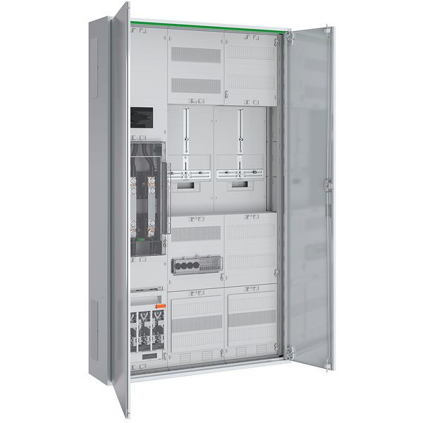 Wandlermessschrank 200 A Dauerstrom nach TAB TEN bestehend aus: Zählerschrank schutzisoliert in IP44, 3x NAR mit 40 mm Sammelschienensystem 2x12x5 mm bestückt mit NH1 Trenner und N-Anschluss, 4x Sammelschienenklemme 120 mm², 1x Wandlermodul BxH 250x450 mm mit Klarsichtabdeckung, 3x Wandlerlasche Bauform A mit 30x5x170 mm, 1x AAR BxH 250x450 mm mit Lasttrennschalter 4-polig 250 A, 1x Wandlerzusatzraum BxH 250x300 mm 24 TE bestückt mit Spannungspfadsicherungen 1x D01 3-polig, Steuersicherung 1x D01 1-polig und Wandler-Trennklemmen nach TAB Mitteldeutschland, 1x 3-Punkt Zählerplatz 450 mm, 1x 3-Punkt FRE-Platz 450 mm, 1x APZ-Raum 300 mm mit RJ45 Schnittstelle