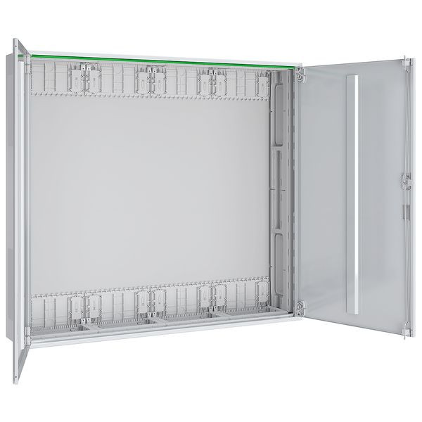 Systemgehäuse für AP-, UP- und teilversenkter Montage, bestehend aus: Leergehäuse mit flächenbündiger Leitungsmembran, seitlichen Vorprägungen für Querverdrahtung im AAR und Sammelschienenverbindung im NAR, Volltür mit Schubstangen, Abmessungen: 1050x950x210 mm, Schutzklasse II (schutzisoliert), Schutzart IP44, Stahlblech pulverbeschichtet, 288 Teilungseinheiten
