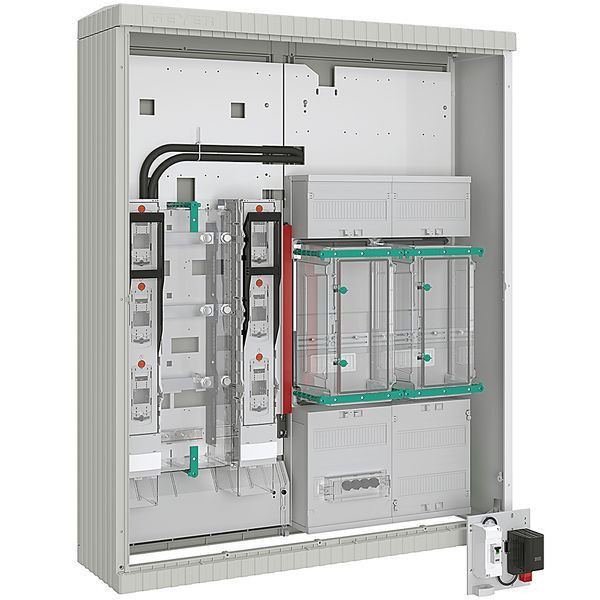 bestehend aus: Gehäuse H x B x T (mm): 1355 x 1110 x 315: - Glasfaser verstärktes Polyester FS 833.5 nach DIN 16913, IP44, ähnlich RAL 7035 - Kunststoffmontageplatte 6 mm - Tür mit Doppelschließung und einem Profilhalbzylinder mit 2 Schlüsseln - Ohne Sockel Leistungsteil H x B (mm): 900 x 500: - Wandlerraum, netz- und anlagenseitiger Anschlussraum (NAR/AAR): Unterkonstruktion Montageplatte (PVC 6 mm), Primärkupferschienen Cu 30 x 10 mm verzinnt und vernickelt, PEN-Schiene mit V-Anschlussklemmen 185 mm² und Berührschutzabdeckung - Wandlerraum mit Klarsicht-Wandlerabdeckung, plombierbar, rundum geschlossen, inkl. Wandlerlasche (170 x 30 x 10 mm) gemäß Form A nach DIN VDE 0603-2-2, Bohrungsabstand 130 mm und Sekundärverdrahtung, inkl. Leerplatz für Überpsannungsschutz - Netzseitige Trennstelle (links): NH2-Sicherungslastschaltleiste, 3-polig schaltbar, mit V-Anschlussklemmen 185 mm² - Anlagenseitige Trennstelle (im AAR): NH2-Sicherungslastschaltleiste, 3-polig schaltbar, mit V-Anschlussklemmen 185 mm² und 1x Leerplatz für weitere NH2-Sicherungslastschaltleiste oder Überspannungsschutz Messteil H x B x T (mm): 900 x 500: - Anlagenseitiger Anschlussraum (AAR, oben), H x B (mm): 2x 150 x 250, mit perforierter 3-Punkt-Haube und Gerätetragschiene, ohne Gerätebestückung - Wandler-Zählerplatz, H x B (mm): 375 x 250, 3-Punkt mit Sekundärverdrahtung und verdrahteter Spannungsversorgungsstecker (FKCOR 2,5/3 ST 5,08) - Wandlerzusatzraum, H x B (mm): 300 x 250, mit geschlossener 3-Punkt-Haube, bestückt mit Spannungspfadsicherung D01 3-polig + 1-polig (für Gateway) unter einer Klarsichthaube und Prüfklemme und Sekundärverdrahtung - Anlagenseitiger Anschlussraum (AAR, oben), H x B (mm): 150 x 250, mit offener 3-Punkt-Haube, Abdeckstreifen und Gerätetragschiene, ohne Gerätebestückung - TRE-Platz, H x B (mm): 150 x 250, 3-Punkt mit Steuerverdrahtung - APZ-Raum, H x B (mm): 300 x 250, mit LexCom Home-Mediamontageplatte und Gerätetragschiene, bestückt mit RJ45-Buchse und verdrahtetem Spannungsversorgungsstecker (FKCOR 2,5/3 ST 5,08) Schaltschrankheizung: - Schaltschrankheizung für KVS, zur Vermeidung von Kondensfeuchtigkeit - 230 V, 33 W, thermostatisch gesteuert - Montage im Sockel