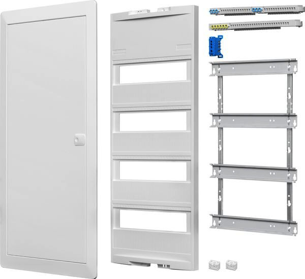 Einbausets mit Steckklemmen,PE 6 x2,5-16 + 21 x1,5-4mm²,N+N 2 x(3 x2,5-16 + 14 x1,4-4mm²),zusätzliche N-FI-Klemme 3 x16,2 x10mm²,TE je 18mm 48,Reihen 4,Einbausets,Schutzisoliert II,Schutzart: IP30,Für Geräte bis 63A,Einfachster Türanschlagwechsel ohne Demontage des Blendrahmens,Flacher Türverschluss mit Schnapptechnik,EinfachesAustauschen gegen ein Schloss,Geeignet für Einbaugeräte bis 70mm Tiefe,Farbton: RAL 9016 (verkehrsweiß),Gebaut nach DIN VDE 0603-1,DIN 43871,Mauerkasten:,MauerkastenAus Kunststoff,Befestigungshaken (HW),Nagellaschen (UP),Putzschutzplatte,Einbauset:,Traggerüst mit Gerätetragschiene,Geräteabdeckung,Blendrahmen mit Volltür und Putzausgleich,N/PE-Steckklemmen,N-FI-Erweiterungsklemme (in 2-,3- und 4-reihigen Verteiler),Stromkreisbeschriftungen und Blatt mit Piktogrammen,