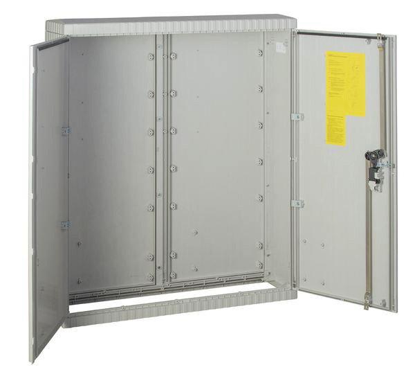 Aus glasfaserverstärktem Polyester, lichtgrau RAL 7035, Schutzart IP 44 nach DIN 43629. Mit Tür, vorgerichtet für Doppelschließung, ein Profilhalbzylinder werkseitig eingebaut.
