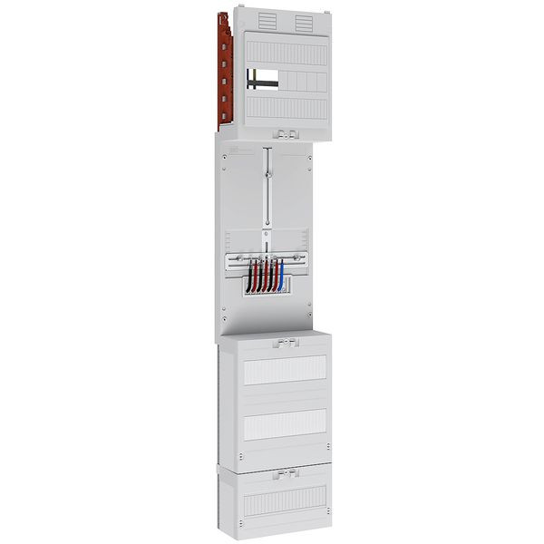 bestehendAus: NetzseitigerAnschlussraum (NAR,oben),H xB (mm): 300 x250: Mit 40mm Sammelschienen,355A,5-polig (Cu 2x12 x5mm),Vorbereitet für den Einbau von SH-Schalter und Überspannungsschutz,Zählerplatz,H xB (mm): 450 x250: 3-Punkt mit 16mm²-Verdrahtung,AnlagenseitigerAnschlussraum (AAR),H xB (mm): 300 x250: Mit perforierter 3-Punkt-Haube und Hauptleitungsabzweigklemme 5 x25mm²Auf Gerätetragschiene
