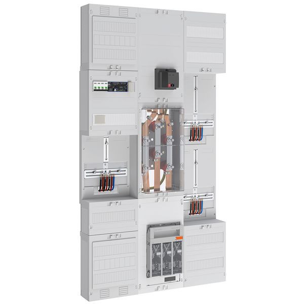 Zähler-Wandlerfeld 200A mit Netz- undAnlagen-Schutz nach TAB Netze BW bestehendAus: 1xNAR mit 40mm Sammelschiene 2x12x5mm bestückt mit NH1 Trenner,1xWandlermodul 450mm mit Wandlerlaschen BauformA mit 30 x5mm,1xAAR Motorbetriebener Lasttrennschalter NSx4-polig 250A für NA-SchutzAnwendung und PE Klemme,1xAAR 300mm 24 TE,1x3-Punkt Zählerplatz 375mm,1xFRE-Platz 375mm 3-Punkt,1xWandlerzusatzraum 300mm 24 TE bestückt mit Spannungspfadsicherungen und Wandler-Trennklemmen,1xAPZ-Raum 300mm mit RJ45 Schnittstelle,1xVerteilerfeld 2-reihig 24 TE mit NA-Schutzsteuerung,1xFRE-Platz 300mm 3-Punkt mit 12 TEAnschlussraum 150mm,1xNAR mit 40mm Sammelschiene 2x12x5mm mit 4xSammelschienenklemme 120mm² 1xSammelschienenklemme 70mm²
