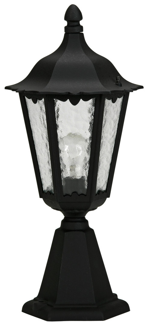 Albert-Sockelleuchte 660541 aus korrosionsbeständigem Aluminiumguß mit Kathedralglas klar. Eingerichtet für 1 x Lampe 75W, Fassung E 27. Anschlussfertig zum aufschrauben auf ein Fundament oder auf den Erdeinbausockel 690011.Farbe: schwarz Schutzart IP 23 - Schutzklasse : 230 x 500 mm