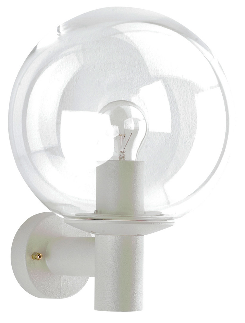 aus korrosionsbeständigem Aluminiumguß mitklarer Kristallglaskugel d 250 mm. Eingerichtet für 1 x A60 75W, Fassung E 27.Farbe: weiß Schutzart IP 44 - Schutzklasse : d 250 x 350 x 270 mm