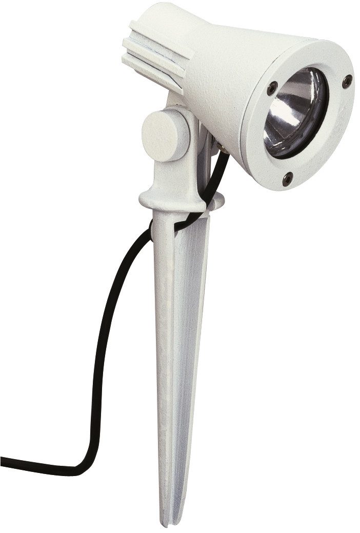 schwenkbar, mit Erdspieß und 2.500 mm Anschluss Leitung inkl. Stecker, aus korrosionsbeständigem Aluminiumguß und Borosilikatglas klar. Eingerichtet für 1 x PAR 20 50 Watt, Fassung E27.Farbe: weiß Schutzart: IP 55 - Schutzklasse : d 100x 350 x 135 mm