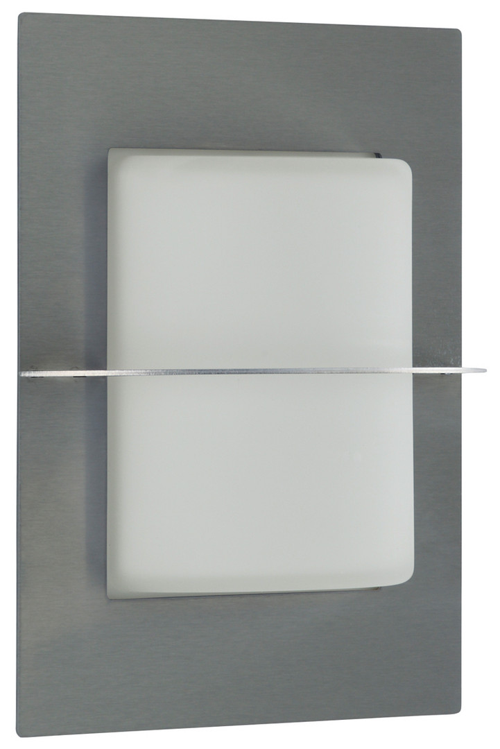 aus Edelstahl mit opalem Glas, Montageplatte aus Aluminiumguß. Eingerichtet für 1 x Glühlampe A60 75 W, Fassung E27.Schutzart IP 44 - Schutzklasse : 200 x 260 x 105 mm