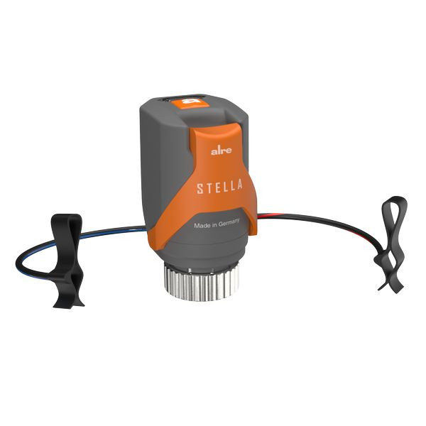 "Stella" - der intelligent autonome elektrothermische Stellantrieb 230 VAC NC für den automatischen adaptiven hydraulischen Abgleich der Heizkreise eines Heizkreisverteilers in Flächenheizungs- und Flächenkühlungssystemen. Sensoren an den Vor- und Rücklaufleitungen messen Temperaturunterschiede und ein Algorithmus berechnet fortlaufend die jeweils erforderliche Temperaturspreizung und die entsprechende Ventilstellung. Stromlos geschlossen und mit Klapphebel zum entlasteten Aufschrauben bzw. zum stromlosen manuellen Öffnen des Thermostatventils. Mit integrierter Vorlauftemperaturbegrenzung. Stella kann in Kombination mit allen gängigen Temperaturreglern und Klemmenleisten verwendet werden. Bei Verwendung von Geräten mit Schaltelement Triac ist eine Spannungsfestigkeit (V DRM) des Triacs von mindestens 800V erforderlich.