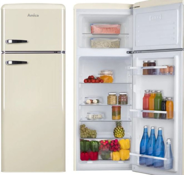 Retro Kollektion-beige, Nutzinhalt total: 206 l-Kühlen: 162 l, Gefrieren: 44 l Kühlen, Abtauung: automatisch, 3 Glasablagen, silberne Applikationen, 1 Gemüseschublade, 3 Türablagen, silberne Applikationen, LED-Beleuchtung, Seite, Zubehör: Eiertablett , efrieren-FrostControl, Abtauung: manuell, 1 Gefrierfach Ablage, Zubehör: Eiswürfelbehälter