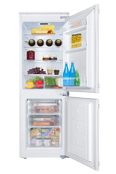 Dieser Einbau-Kühlschrank mit Schlepptür-Technik bietet 202 l Gesamtnutzinhalt (142 l Kühlen, 60 l Gefrieren) und verfügt über elektronische Steuerung, Tür-Offen-Alarm und Inverter Kompressor. Der Kühlbereich hat 3 Glasablagen, 2 Gemüseschubladen, 3 Türablagen, LED-Beleuchtung und Chrom-Flaschengitter. Das manuell abzutauende Gefrierfach enthält 3 Schubladen. Mit Energieeffizienzklasse E verbraucht er 208,4 kWh/Jahr. Die Gefrierleistung beträgt 2,8 kg/24h bei 11h Temperaturanstiegszeit. Die Luftschallemission liegt bei 38 dB(A) (Klasse C). Das Gerät passt in eine Nische von 1575-1578 x 560 x 550 mm, hat einen wechselbaren rechten Türanschlag und wiegt 47,5 kg netto. Es ist für Umgebungstemperaturen von 16-38°C geeignet (Klimaklasse ST).