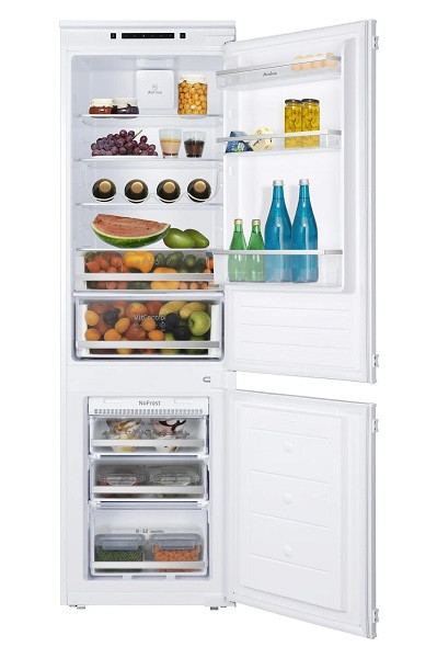 Dieser Einbau-Kühlschrank mit Schlepptür-Technik bietet 246 l Gesamtnutzinhalt (190 l Kühlen, 56 l Gefrieren) und verfügt über elektronische Steuerung, Tür-Offen-Alarm und Inverter Kompressor. Der Kühlbereich mit AirFlow-Umluftkühlen umfasst 2 Glasablagen, 1 VitControl Schublade, 1 Gemüseschublade, 3 Türablagen, LED-Beleuchtung und ein Chrom-Flaschengitter. Das NoFrost-Gefrierfach mit FlexOn enthält 3 Schubladen und 2 Ablagen. Mit Energieeffizienzklasse E verbraucht er 208,1 kWh/Jahr. Die Gefrierleistung beträgt 2,6 kg/24h bei 11h Temperaturanstiegszeit. Die Luftschallemission liegt bei 41 dB(A) (Klasse C). Das Gerät passt in eine Nische von 1771-1774 x 560 x 550 mm, hat einen wechselbaren rechten Türanschlag und wiegt 63 kg netto. Es ist für Umgebungstemperaturen von 10-38°C geeignet (Klimaklasse SN-ST)
