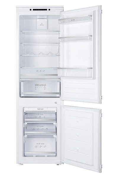 Dieser Einbau-Kühlschrank mit Schlepptür-Technik bietet 246 l Gesamtnutzinhalt (190 l Kühlen, 56 l Gefrieren) und verfügt über elektronische Steuerung, Tür-Offen-Alarm und Inverter Kompressor. Der Kühlbereich mit AirFlow-Umluftkühlen umfasst 2 Glasablagen, 1 VitControl Schublade, 1 Gemüseschublade, 3 Türablagen, LED-Beleuchtung und ein Chrom-Flaschengitter. Das NoFrost-Gefrierfach mit FlexOn enthält 3 Schubladen und 2 Ablagen. Mit Energieeffizienzklasse D verbraucht er 166,1 kWh/Jahr. Die Gefrierleistung beträgt 2,6 kg/24h bei 11h Temperaturanstiegszeit. Die Luftschallemission liegt bei 41 dB(A) (Klasse C). Das Gerät passt in eine Nische von 1771-1774 x 560 x 550 mm, hat einen wechselbaren rechten Türanschlag und wiegt 63 kg netto. Es ist für Umgebungstemperaturen von 10-38°C geeignet (Klimaklasse SN-ST).