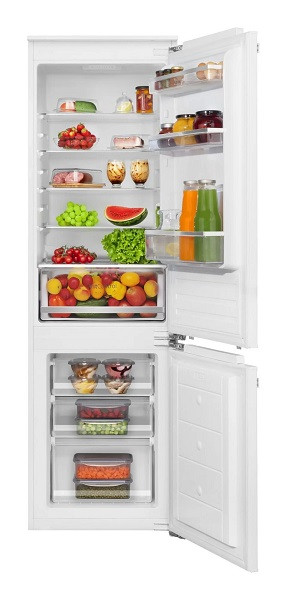 Dieser Einbau-Kühlschrank mit Festtür-Technik bietet 270 l Gesamtnutzinhalt (195 l Kühlen, 75 l Gefrieren) und verfügt über elektronische Steuerung, Tür-Offen-Alarm und Inverter Kompressor. Der Kühlbereich hat 4 Glasablagen, 1 VitControl Schublade, 3 Türablagen und LED-Beleuchtung. Das Gefrierfach mit FrostControl enthält 3 Schubladen und 2 Ablagen. Mit Energieeffizienzklasse D verbraucht er 177,4 kWh/Jahr. Die Gefrierleistung beträgt 3,5 kg/24h bei 12h Temperaturanstiegszeit. Die Luftschallemission liegt bei 35 dB(A) (Klasse B). Das Gerät passt in eine Nische von 1771-1774 x 560 x 560 mm, hat einen wechselbaren rechten Türanschlag und wiegt 54 kg netto. Es ist für Umgebungstemperaturen von 10-38°C geeignet (Klimaklasse SN-ST).