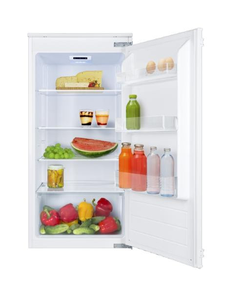 Dieser Einbaukühlschrank mit Schlepptür-Technik und 158 l Nutzinhalt bietet elektronische Steuerung, Tür-Offen-Alarm und einen energieeffizienten Inverter-Kompressor. Im Kühlraum finden sich 3 Glasablagen, 1 Gemüseschublade, 3 Türablagen und eine LED-Beleuchtung. Mit der Energieeffizienzklasse E verbraucht er 95,3 kWh/Jahr. Bei einer Geräuschemission von 38 dB(A) ist er relativ leise (Klasse C). Die Einbaunische sollte 1022-1025 x 560 x 550 mm (HxBxT) messen. Der Kühlschrank ist für Umgebungstemperaturen von 10-38°C geeignet und wiegt 31,5 kg netto. Praktische Extras sind ein Eiertablett und eine integrierte Flaschenablage.