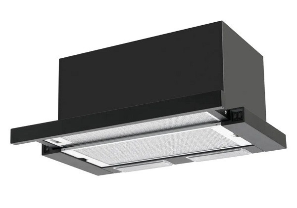 Flachschirmhaube, 60 cm, schwarz, Kippschalter, Lichtwärme 2700 K, Abluft-/Umluftbetrieb, 3 Leistungsstufen 280-648 m³/h, Beleuchtung: 2 x LED / 3,0 W, 2 Aluminium Fettfilter, spülmaschinengeeignet