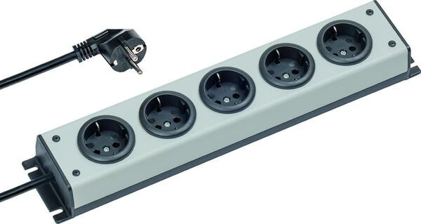 ohne Schalter Schutzkontakt Kunststoff-Steckdosenleiste,silber-schwarz,mit 5 Schuko Steckdosen 90° gedreht,Gehaeuse aus schlagfestem halogenfreiem Kunststoff,Zuleitung: 2,0m H05VV-F 3G1,5,angespritzer Schuko-Winkelstecker,Optimale Auslastung der Steckplaetze möglich (Abstand Mitte Dose zu Mitte Dose 60mm),VDE/GS-Zeichen,Nennspannung: 250VAC; Nennstrom: 16A,wiederanschliessbar,integrierte Montagelasche,Masse (LxB):371x72mm