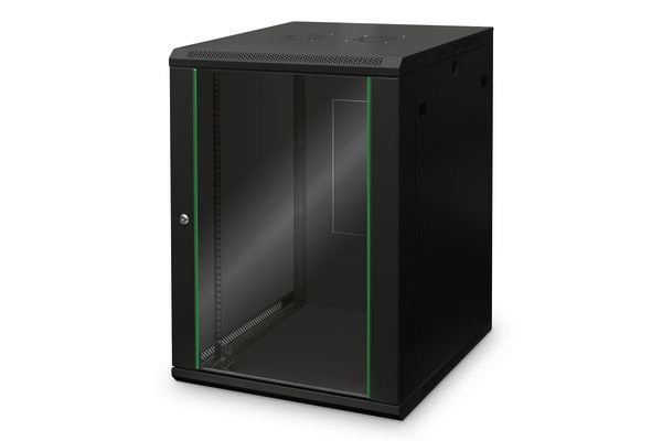 16HE Wandgehäuse 785x600x600 mm, Farbe Schwarz (RAL 9005) - Optimale Be- und Entlüftung - Abschließbare Glastür garantiert Sicherheit - 483 mm (19“)-Profilschienen an der Vorder- und Rückseite innerhalb des Schrankes montiert, galvanisiert Die Netzwerkschränke zur Wandmontage der Dynamic Serie wurden für einen einfachen und besonders kostenoptimierten Netzwerkausbau entwickelt. Dach, Boden und Rückwand eines jeden Schrankes sind mit einem vorgestanzten Kabeleinlass ausgestattet. Für die Aufnahme eines Lüftermoduls wird das Dachchassis ebenfalls mit einem ausgestanzten Bereich versehen. Zwei Paar galvanisierte, mit in beide Richtungen ablesbare Höheneinheiten beschriftete 483 mm (19")-Profilschienen sind im Inneren verbaut. Diese lassen sich in der Tiefe verstellen. Jeder Schrank ist eine robuste Stahlkonstruktion aus bis zu 1,2 mm starkem Stahlblech. Die Farbgebung erfolgt in Form von elektrostatischer Pulverbeschichtung in den Standardfarben Grau (RAL 7035) und Schwarz (RAL 9005). Abnehmbare Seitenwände sowie die abschließ- und abnehmbare Fronttür, verbessern die Zugänglichkeit. Ein Türanschlagswechsel kann vorgenommen werden. Die Wandmontage erfolgt in zwei einfachen Arbeitsschritten: Das mitgelieferte Montageblech wird an die Wand geschraubt und im Anschluss mit dem Gehäuse verbunden.