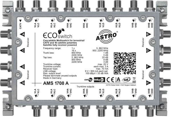 Kaskadierbarer Multischalter für das AMS 17er Ecoswitch-System, 17 Eingänge für 4 Satellitenpositionen plus Terrestrik, 8 Teilnehmerausgänge