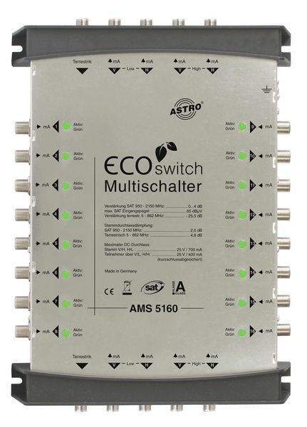 Kaskadierbarer, rückwärts speisbarer Multischalter für das AMS 5er Ecoswitch-System, 5 Eingänge für eine Satellitenposition plus Terrestrik, 16 Teilnehmerausgänge, Stand-alone Betrieb mit Receiverspeisung möglich, kann vor jedem Multischalter betrieben werden, Betrieb nur mit Quatro-Universal LNB, LNB-Versorgung über V/L und H/H