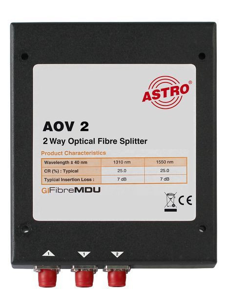 Optischer 2-fach Verteiler, ca. 4 dB Verteildämpfung, FC/PC Konnektoren, zur Verwendung in optischen SAT-ZF Verteilsystemen (in Verbindung mit AOF…/ AOFE… Verteilmaterial)