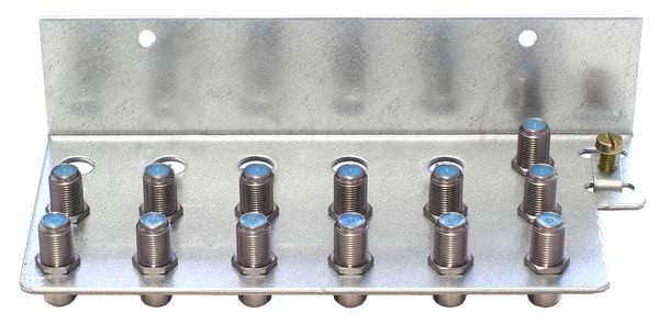 Erdungswinkel, zum Anschluss von einer Erdungsleitung und 13 Koaxialkabeln, bestückt mit 13 x FBB 07 prof F-Buchse / F-Buchse Adapter